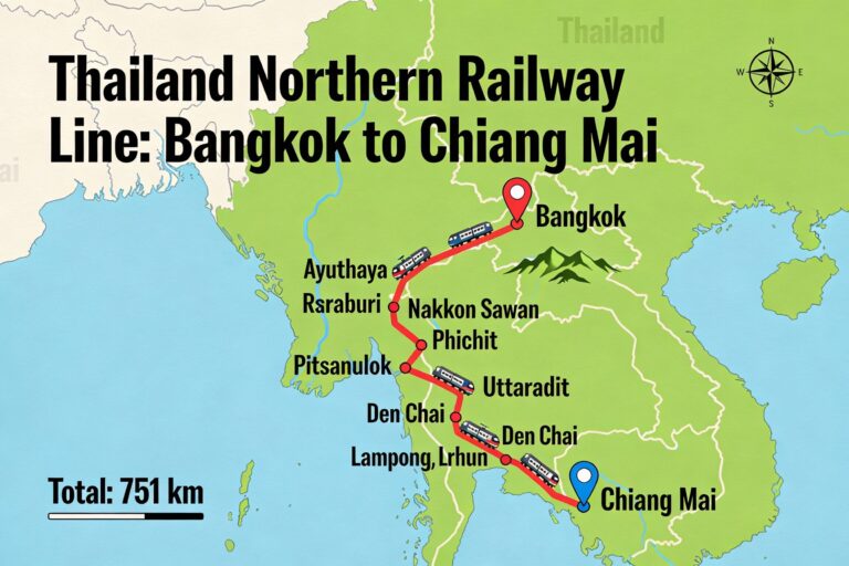 The Bangkok-Chiang Mai train route is Thailand’s most popular long-distance rail journey, covering 751 kilometers through stunning countryside, rice fields, and mountain scenery. Trains run daily, with both daytime (10-12 hours) and night sleeper options (12-14 hours).